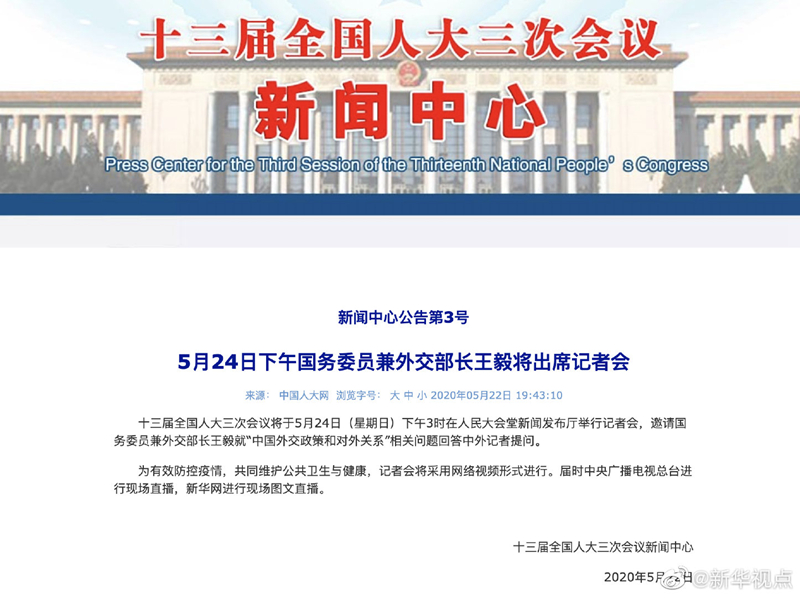 十三屆全國人大三次會議將于5月24日(星期日)下午3時在人民大會堂新聞發(fā)布廳舉行記者會,邀請國務委員兼外交部長王毅就“中國外交政策和對外關系”相關問題回答中外記者提問。
