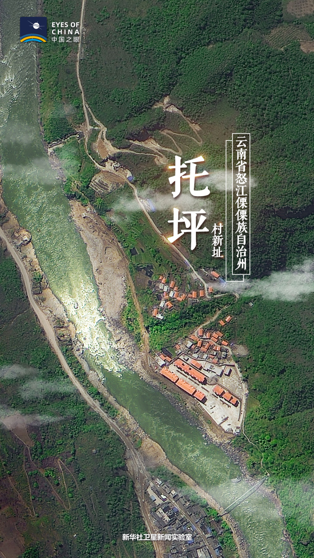 ↑從衛(wèi)星可以看到,綠樹(shù)環(huán)繞的托坪村新址位于在怒江邊上。