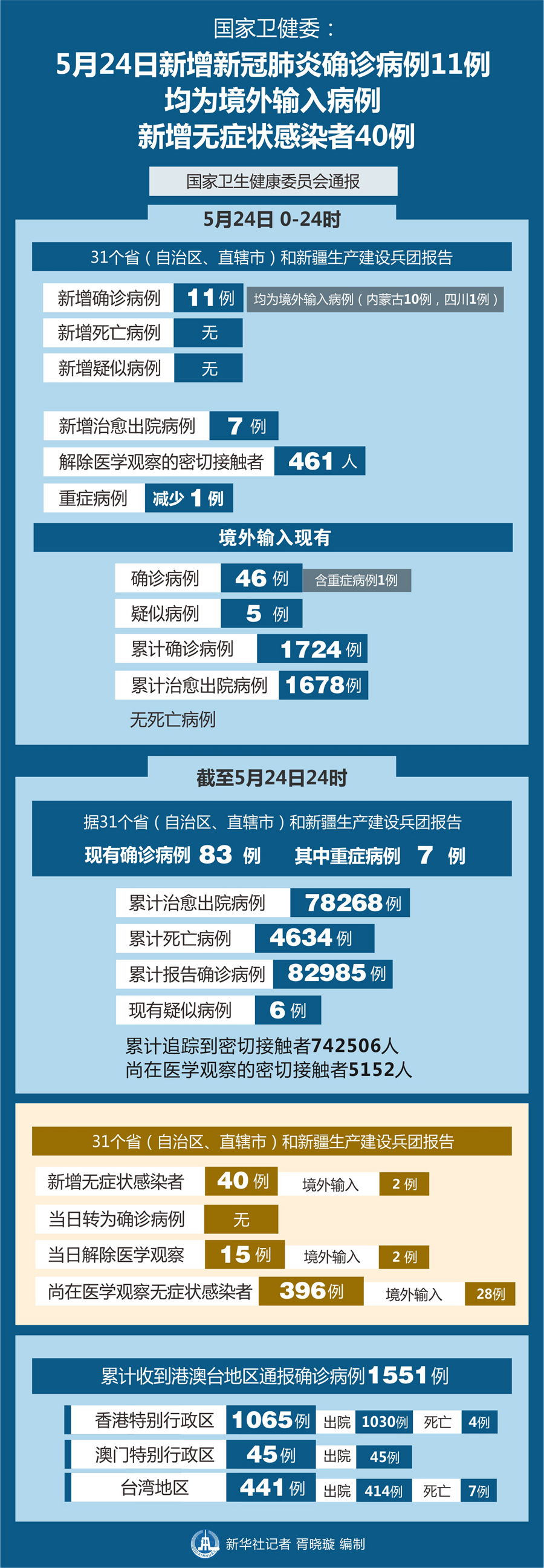 截至5月24日24時(shí),據(jù)31個(gè)?。ㄗ灾螀^(qū)、直轄市)和新疆生產(chǎn)建設(shè)兵團(tuán)報(bào)告,現(xiàn)有確診病例83例(其中重癥病例7例),累計(jì)治愈出院病例78268例,累計(jì)死亡病例4634例,累計(jì)報(bào)告確診病例82985例,現(xiàn)有疑似病例6例。累計(jì)追蹤到密切接觸者742506人,尚在醫(yī)學(xué)觀察的密切接觸者5152人。