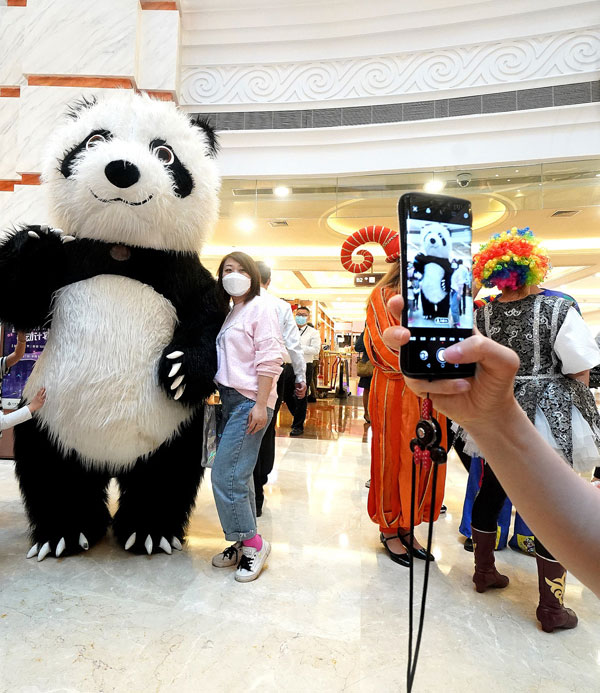 5月5日,顧客在上海環(huán)球港商場(chǎng)與大熊貓人偶合影 陳飛攝