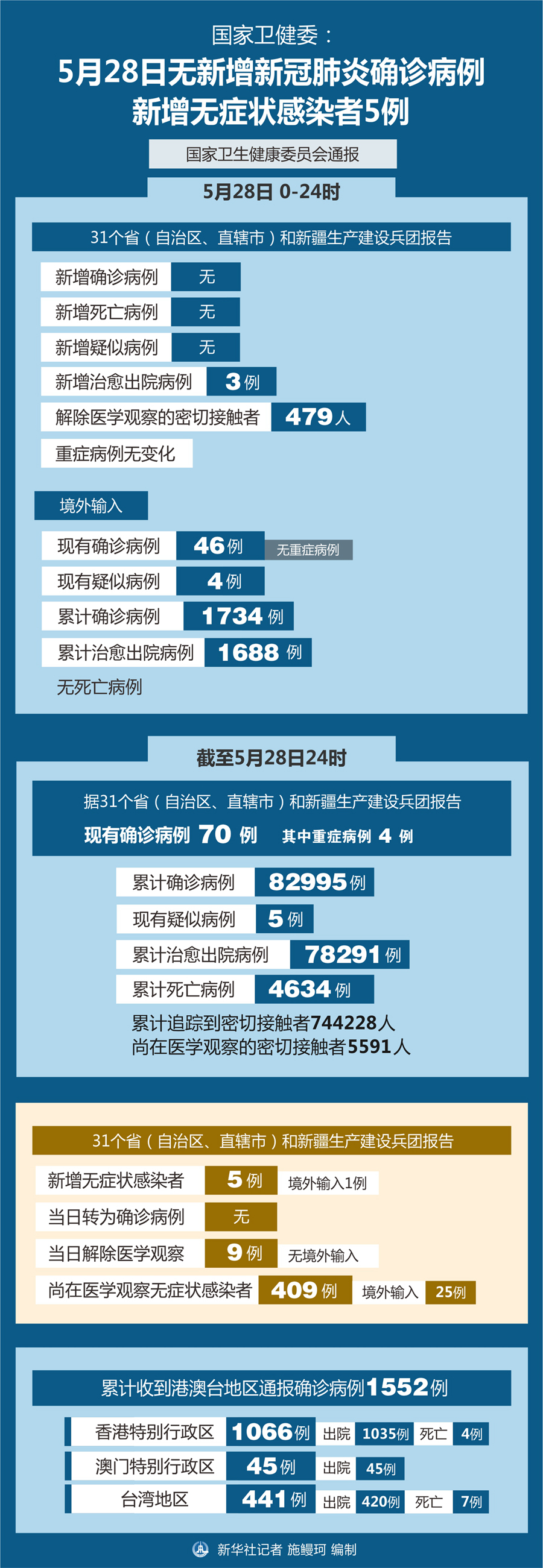 截至5月28日24時(shí),據(jù)31個(gè)省(自治區(qū)、直轄市)和新疆生產(chǎn)建設(shè)兵團(tuán)報(bào)告,現(xiàn)有確診病例70例(其中重癥病例4例),累計(jì)治愈出院病例78291例,累計(jì)死亡病例4634例,累計(jì)報(bào)告確診病例82995例,現(xiàn)有疑似病例5例。累計(jì)追蹤到密切接觸者744228人,尚在醫(yī)學(xué)觀察的密切接觸者5591人。