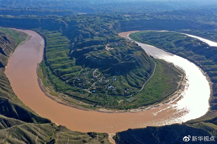 這是2019年8月28日拍攝的山西省永和縣閣底鄉(xiāng)境內(nèi)黃河乾坤灣(無人機(jī)照片)。新華社記者 曹陽 攝