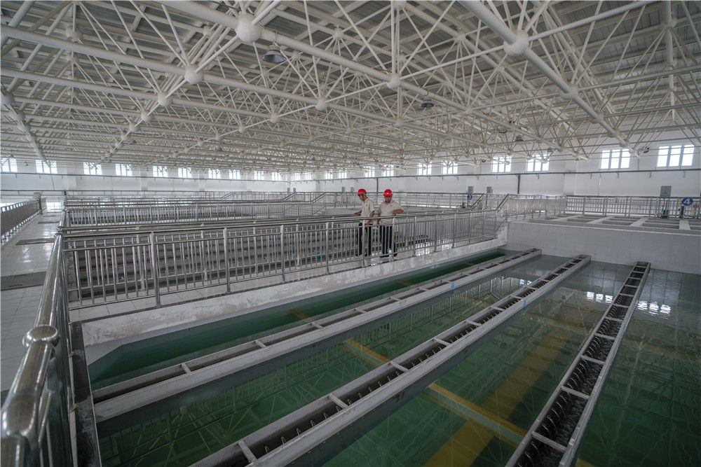 在新疆喀什地區(qū)城鄉(xiāng)供水總水廠里,工作人員檢查清水池工作情況(6月8日攝)。這些安全水將通過近112公里的主管道直達伽師縣,供應(yīng)當?shù)鼐用裼盟?/span>新華社記者 趙戈 攝