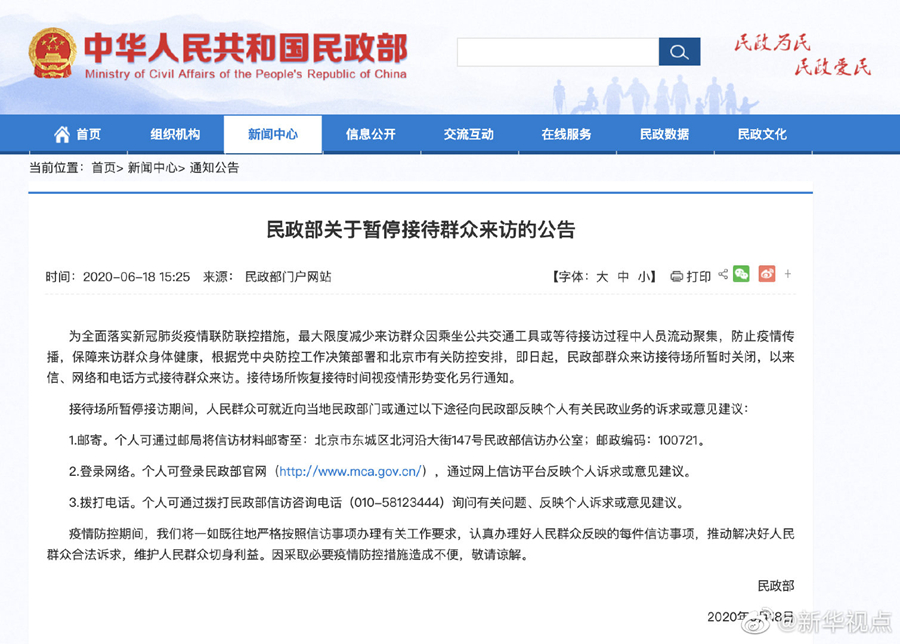 民政部即日起暫停接待群眾來訪-新華網(wǎng)