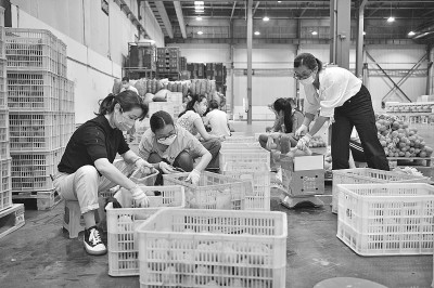 6月18日,湖北省宜昌市夷陵區(qū)電商產(chǎn)業(yè)城工人對(duì)網(wǎng)民訂購的橙子進(jìn)行包裝準(zhǔn)備發(fā)貨。張國榮攝/光明圖片