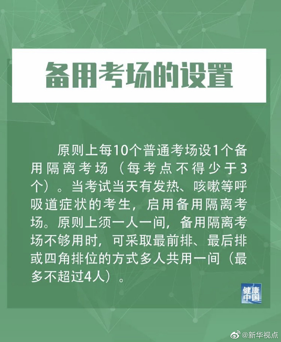 對于備用考場的設(shè)置,措施提到,原則上每10個普通考場設(shè)1個備用隔離考場(每考點(diǎn)不得少于3個)。當(dāng)考試當(dāng)天有發(fā)熱、咳嗽等呼吸道癥狀的考生,啟用備用隔離考場。原則上須一人一間,備用隔離考場不夠用時,可采取最前排、最后排或四角排位的方式多人共用一間(最多不超過4人)。