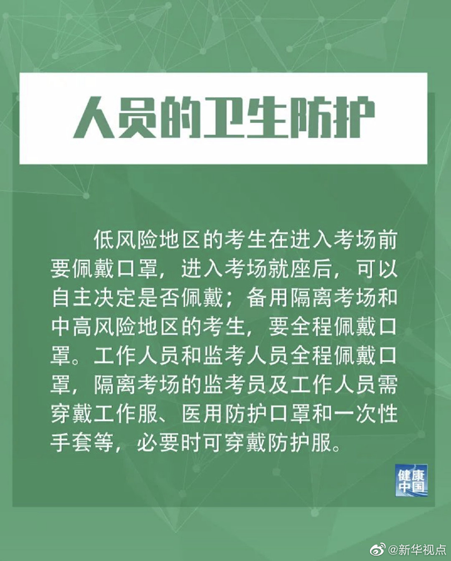 措施提到,低風(fēng)險地區(qū)的考生在進(jìn)入考場前要佩戴口罩,進(jìn)入考場就座后,可以自主決定是否佩戴;備用隔離考場和中高風(fēng)險地區(qū)的考生,要全程佩戴口罩。工作人員和監(jiān)考人員全程佩戴口罩,隔離考場的監(jiān)考員及工作人員須穿戴工作服、醫(yī)用防護(hù)口罩和一次性手套等,必要時可穿戴防護(hù)服。