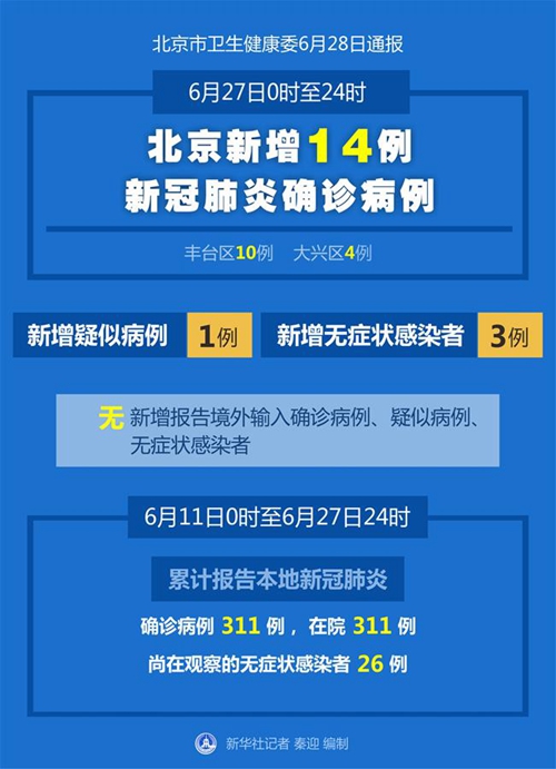 6月11日0時(shí)至6月27日24時(shí),北京市累計(jì)報(bào)告本地新冠肺炎確診病例311例,在院311例,尚在觀察的無癥狀感染者26例。