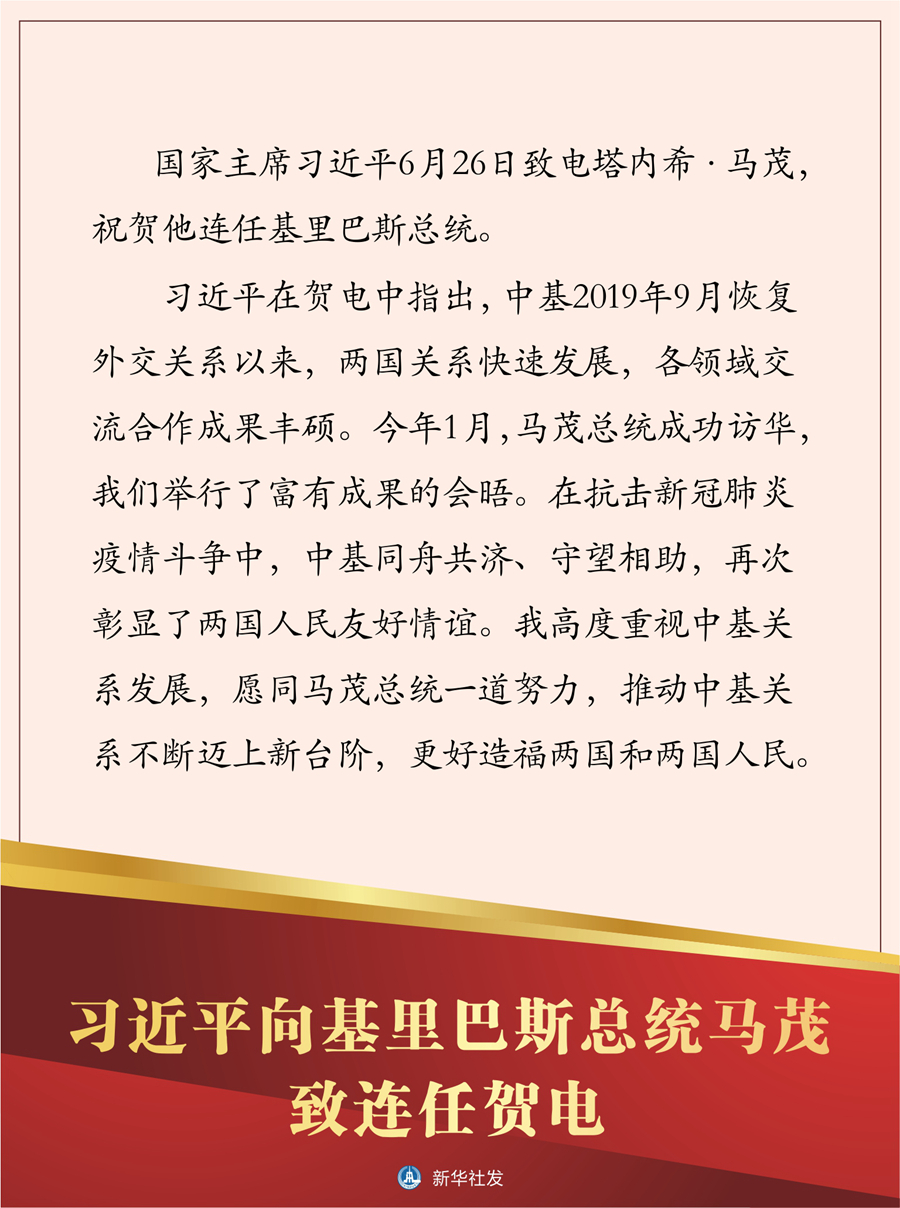 習(xí)近平在賀電中指出,中基2019年9月恢復(fù)外交關(guān)系以來,兩國關(guān)系快速發(fā)展,各領(lǐng)域交流合作成果豐碩。今年1月,馬茂總統(tǒng)成功訪華,我們舉行了富有成果的會晤。在抗擊新冠肺炎疫情斗爭中,中基同舟共濟(jì)、守望相助,再次彰顯了兩國人民友好情誼。我高度重視中基關(guān)系發(fā)展,愿同馬茂總統(tǒng)一道努力,推動中基關(guān)系不斷邁上新臺階,更好造福兩國和兩國人民。