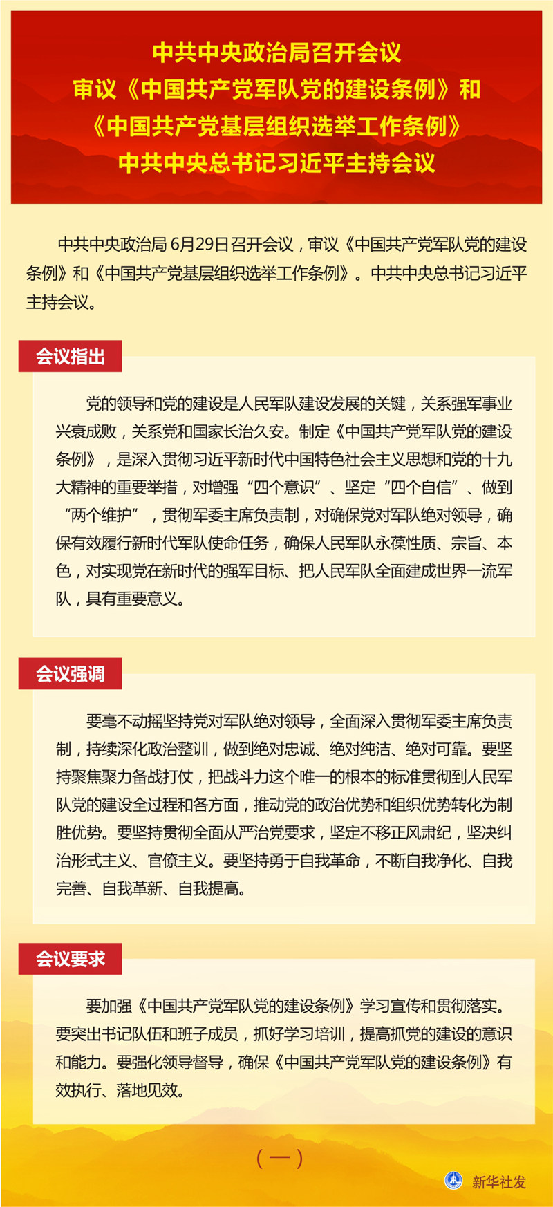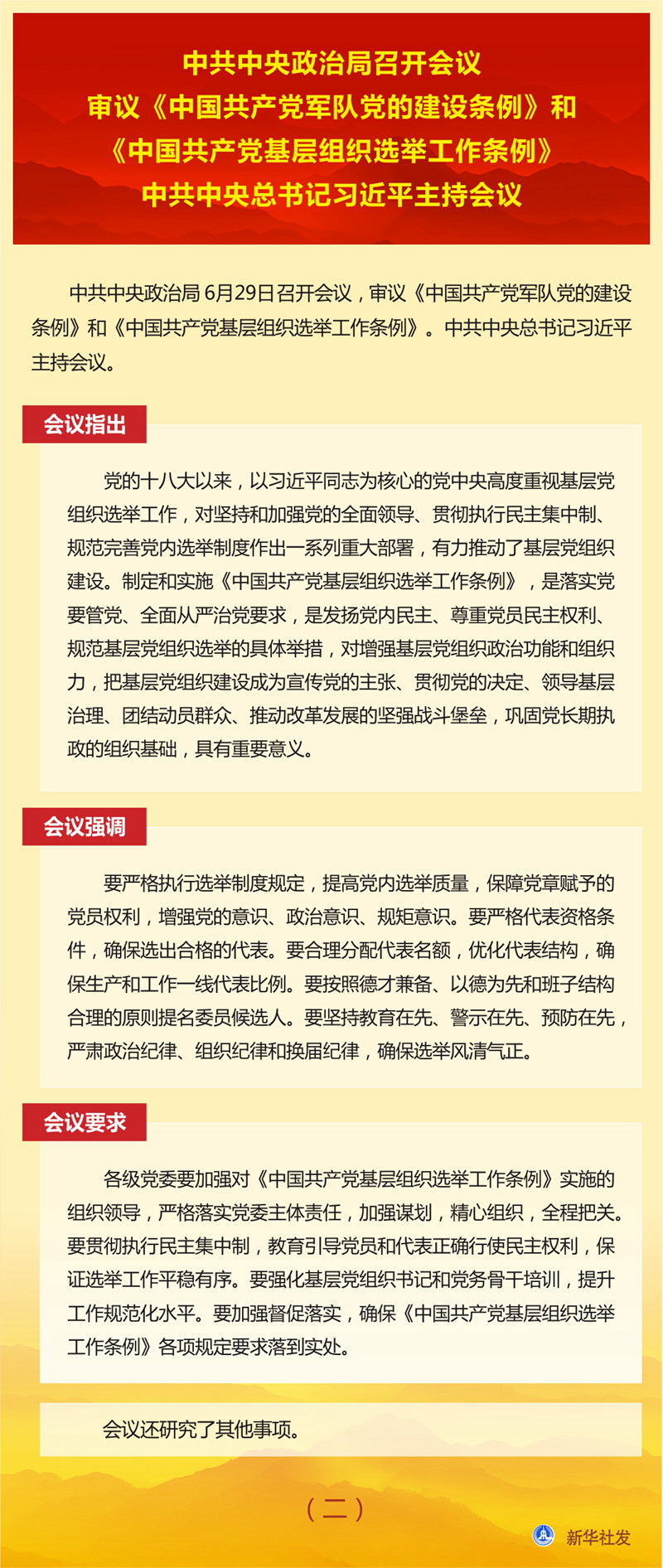 新華社北京6月29日電? 中共中央政治局6月29日召開會議,審議《中國共產(chǎn)黨軍隊(duì)黨的建設(shè)條例》和《中國共產(chǎn)黨基層組織選舉工作條例》。中共中央總書記習(xí)近平主持會議。