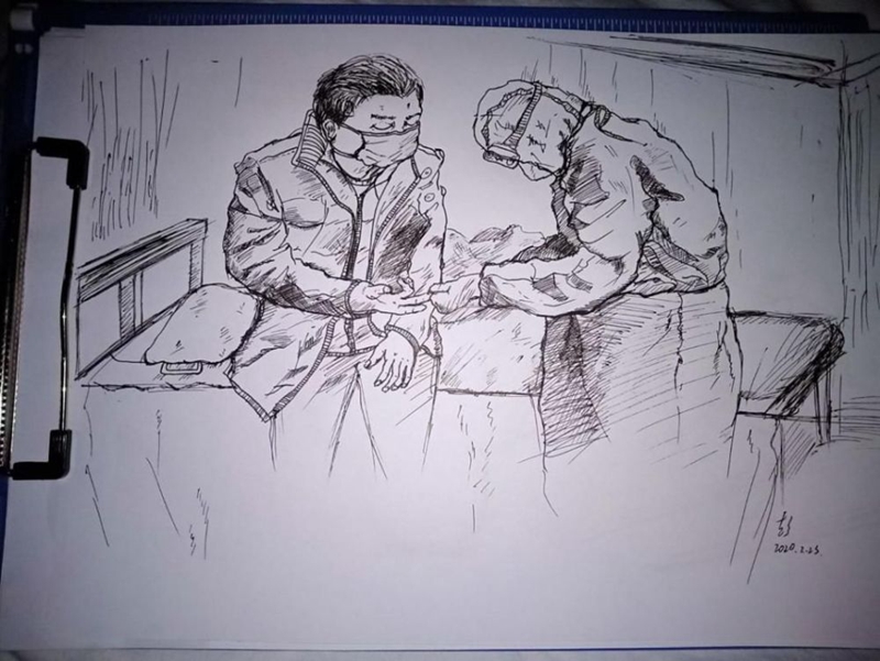 2月27日,來自貴州遵義的援鄂醫(yī)療隊護(hù)士長李蘭收到了患者送給她的一份珍貴禮物——一幅素描畫。畫中的李蘭正在悉心照顧病患,穿著防護(hù)服的身影,充滿著溫暖的力量……