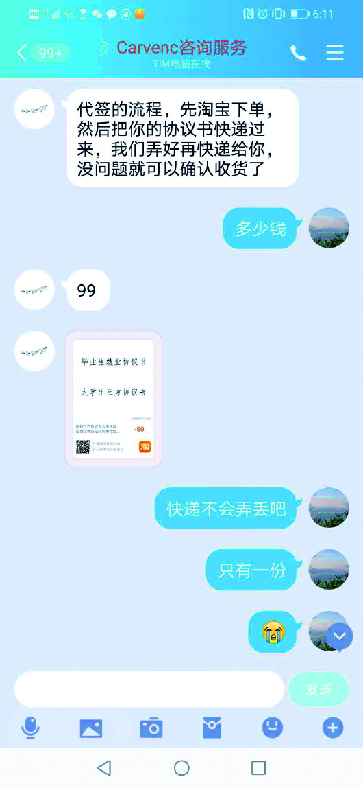 淘寶網(wǎng)上有多家能代簽三方協(xié)議的商家。在看到記者“能否代蓋三方協(xié)議公章”的留言后,一家名為“carvenc education”的商家立即追問所在學(xué)校、專業(yè)。記者提供相關(guān)信息后,不到一分鐘,商家就發(fā)來相匹配的公司名稱和崗位,“只要99元,協(xié)議書真實有效,包回訪?!?/p>