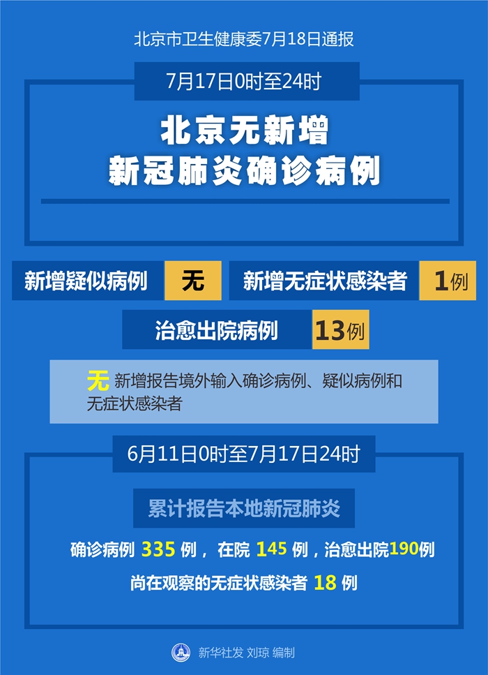 6月11日0時至7月17日24時,北京市累計(jì)報(bào)告本地新冠肺炎確診病例335例,在院145例,治愈出院190例,尚在觀察的無癥狀感染者18例。