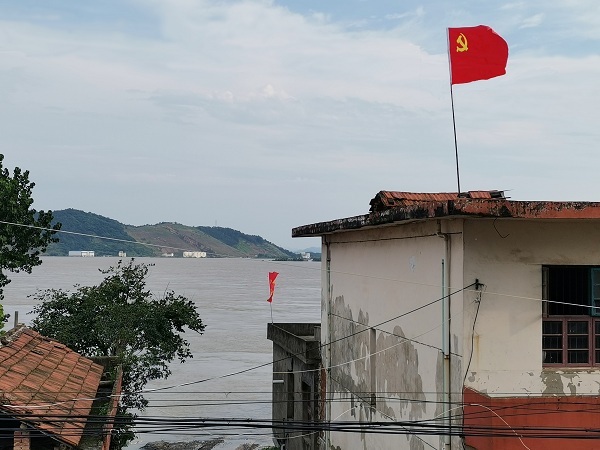 江西省九江市紀委監(jiān)委黨員突擊隊在彭澤縣棉船鎮(zhèn)與群眾一起奮力抗汛,圖為黨旗在鎮(zhèn)渡輪碼頭高高飄揚。許久 攝