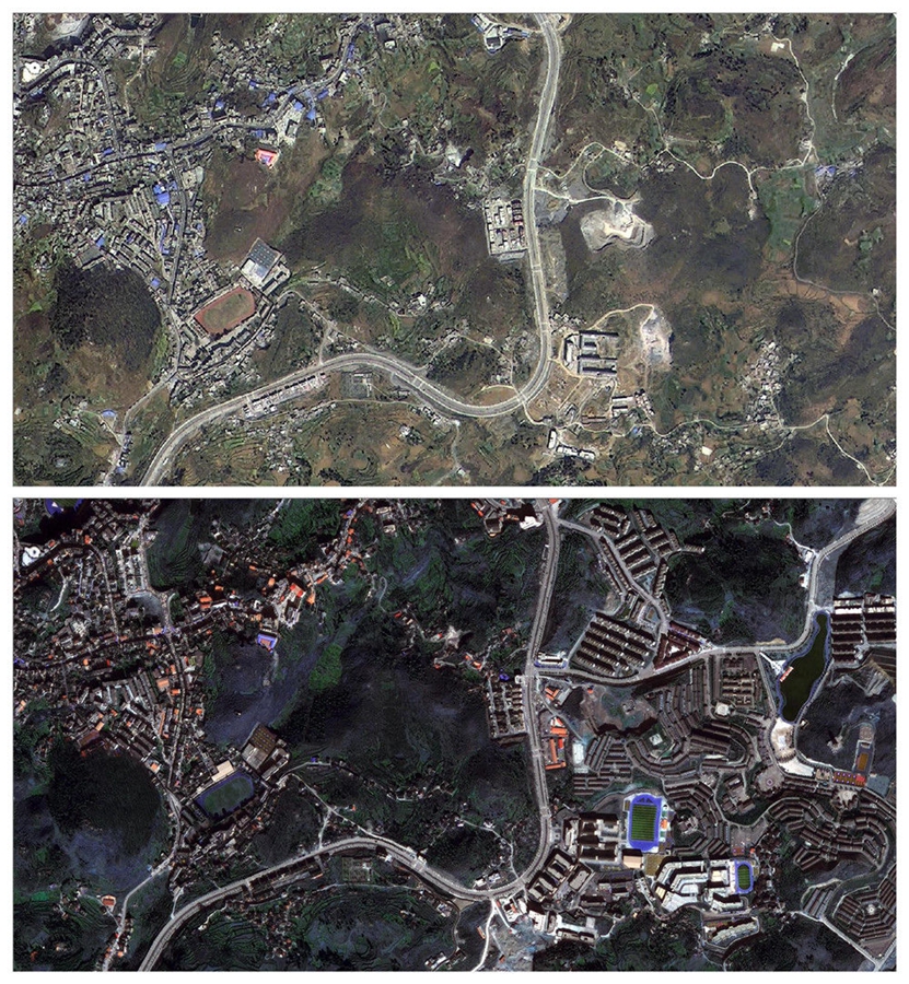 拼版照片的上圖為2015年建設(shè)前的貴州省晴隆縣三寶街道阿妹戚托小鎮(zhèn)衛(wèi)星地圖截圖(以公路為界:右為阿妹戚托小鎮(zhèn),左為晴隆縣城);下圖為2019年建設(shè)完成后的阿妹戚托小鎮(zhèn)衛(wèi)星地圖截圖。新華社發(fā)(貴州省測(cè)繪資料檔案館供圖)