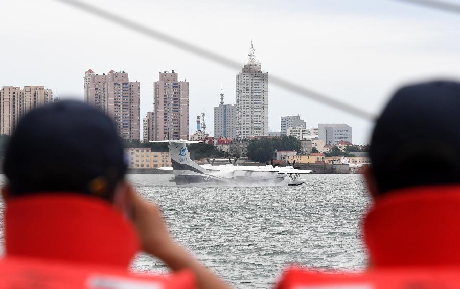 7月26日,水陸兩棲飛機(jī)AG600在日照山字河機(jī)場(chǎng)起飛。新華社記者 王凱 攝