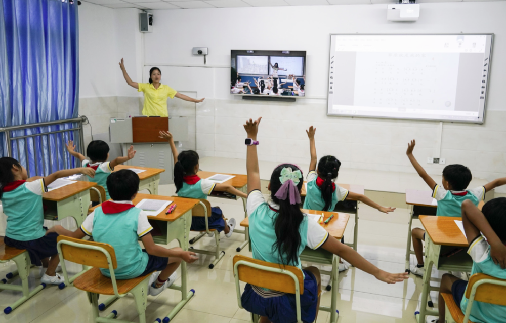 三沙市永興學(xué)校老師張利帶著學(xué)生,通過遠(yuǎn)程在線教育系統(tǒng),與??谑袨I海第九小學(xué)的老師和學(xué)生一起上音樂課 (沈伯韓/攝)