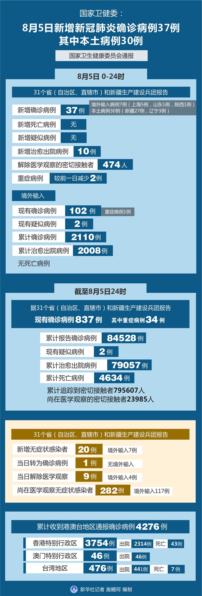 截至8月5日24時,據(jù)31個?。ㄗ灾螀^(qū)、直轄市)和新疆生產(chǎn)建設(shè)兵團(tuán)報告,現(xiàn)有確診病例837例(其中重癥病例34例),累計(jì)治愈出院病例79057例,累計(jì)死亡病例4634例,累計(jì)報告確診病例84528例,現(xiàn)有疑似病例2例。累計(jì)追蹤到密切接觸者795607人,尚在醫(yī)學(xué)觀察的密切接觸者23985人。