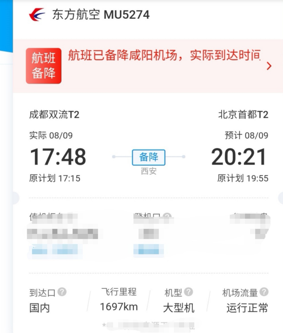 9日傍晚備降西安的東航MU5274次航班上的乘客已更換飛機(jī),于9日21:43,從西安咸陽(yáng)國(guó)際機(jī)場(chǎng)起飛前往目的地北京。