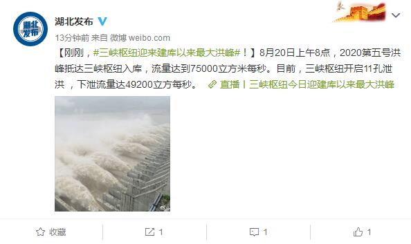 據(jù)湖北省人民政府新聞辦公室官方微博消息,三峽樞紐迎來建庫以來最大洪峰,當(dāng)日上午8點,2020第五號洪峰抵達三峽樞紐入庫,流量達到75000立方米每秒。