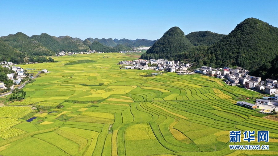 8月26日拍攝的貴州省安龍縣招堤街道海莊村的稻田景色(無人機照片)。 時下,浙江、湖南、貴州等地水稻陸續(xù)進入成熟期,豐收在望。 新華社發(fā)(劉朝富 攝)
