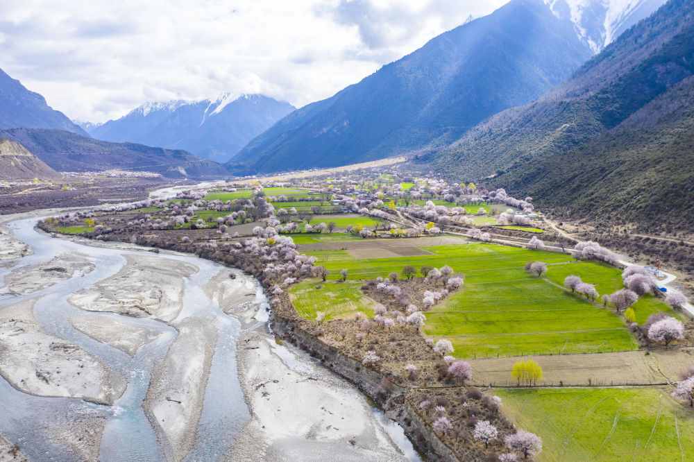 西藏林芝市波密縣境內(nèi)桃花盛開的田園風光(3月26日攝,無人機照片)。新華社記者 普布扎西 攝
