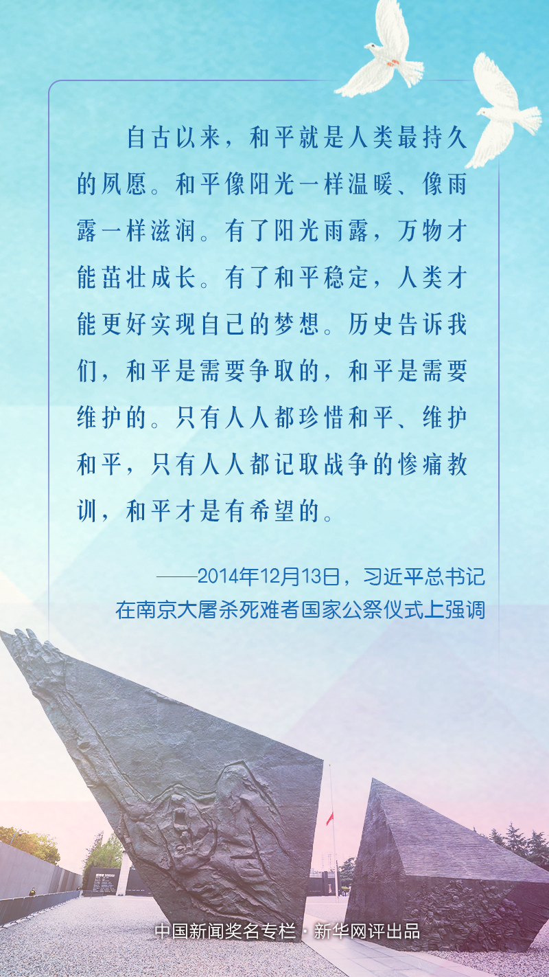 和平是人類的永恒期望。今天,和平與發(fā)展已經(jīng)成為時代主題,但世界仍很不太平,戰(zhàn)爭的達摩克利斯之劍依然懸在人類頭上。歷史告訴我們,和平需要爭取,更需要維護。只有人人都珍惜和平、維護和平,只有人人都汲取戰(zhàn)爭的慘痛教訓,和平才會更有希望。我們要以史為鑒,堅定維護和平的決心,堅定不移走和平發(fā)展道路,才能推動建設持久和平、普遍安全、共同繁榮、開放包容、清潔美麗的新世界,讓和平的陽光永遠普照人類生活的星球。