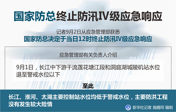 新華社北京9月2日電(記者劉夏村)記者2日從應(yīng)急管理部獲悉,國家防總決定于當日12時終止防汛Ⅳ級應(yīng)急響應(yīng)。