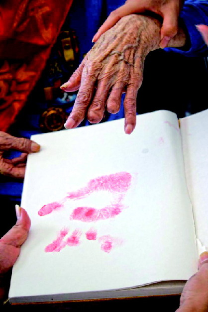 “我們一直在想辦法為抗戰(zhàn)老兵留下一些印記。最開始想出影集,可是考慮到經(jīng)費(fèi)的原因,我們決定留手印?!薄昂侠媳摇必?fù)責(zé)人老魚說,留手印是既有紀(jì)念意義、又“花錢少”的方式,“我們的經(jīng)費(fèi)很寶貴,每一分錢都要直接用在老兵身上?!?/p>