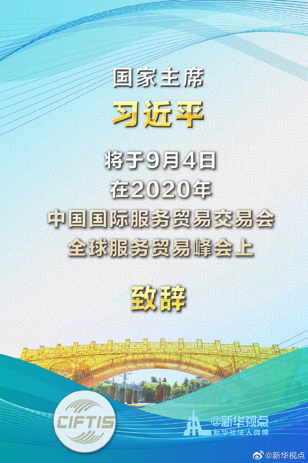 新華社北京9月3日電 外交部發(fā)言人華春瑩3日宣布:2020年中國(guó)國(guó)際服務(wù)貿(mào)易交易會(huì)全球服務(wù)貿(mào)易峰會(huì)將于9月4日在北京舉行。國(guó)家主席習(xí)近平將在峰會(huì)上致辭。
