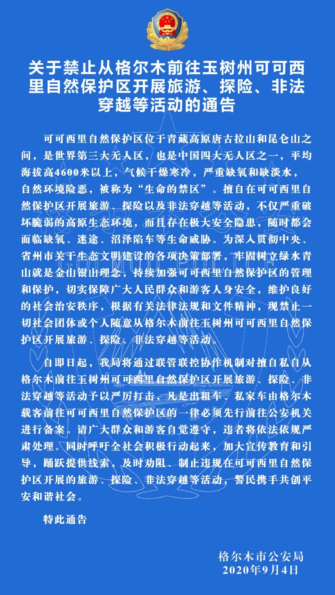據(jù)格爾木公安微信公眾號(hào)消息,9月4日,青海省格爾木市公安局發(fā)布通告,禁止一切社會(huì)團(tuán)體或個(gè)人隨意從格爾木前往玉樹(shù)州可可西里自然保護(hù)區(qū)開(kāi)展旅游、探險(xiǎn)、非法穿越等活動(dòng),即日起將對(duì)上述行為予以嚴(yán)厲打擊,凡是出租車(chē)、私家車(chē)由格爾木載客前往可可西里自然保護(hù)區(qū)的一律必須先行前往公安機(jī)關(guān)進(jìn)行備案。