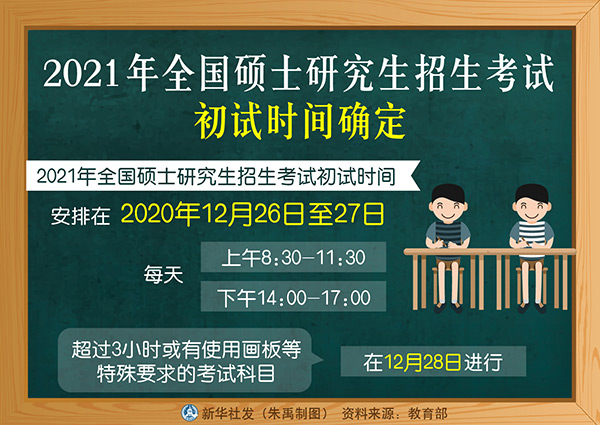新華社北京9月4日電(記者胡浩)記者4日從教育部了解到,2021年全國碩士研究生招生考試初試時間安排在2020年12月26日至27日(每天上午8:30-11:30,下午14:00-17:00),超過3小時或有使用畫板等特殊要求的考試科目在12月28日進行。