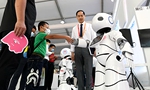 9月5日,在服貿(mào)會綜合展區(qū),一位女士嘗試與機器人握手。 新華社記者 彭子洋 攝