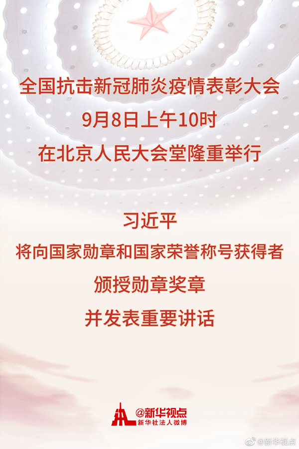 新華社北京9月6日電? 全國抗擊新冠肺炎疫情表彰大會(huì)將于9月8日上午10時(shí)在北京人民大會(huì)堂隆重舉行。中共中央總書記、國家主席、中央軍委主席習(xí)近平將向國家勛章和國家榮譽(yù)稱號(hào)獲得者頒授勛章獎(jiǎng)?wù)虏l(fā)表重要講話。