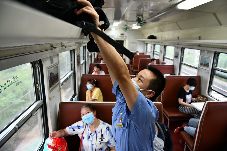 乘務(wù)員在漢中站核查8361次旅客身份證。(8月22日攝)