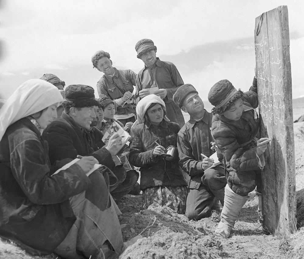 ↑ 1960年,新疆塔什庫(kù)爾干塔吉克族自治縣慕士塔格人民公社二大隊(duì)的社員在小學(xué)生的幫助下學(xué)習(xí)文化。