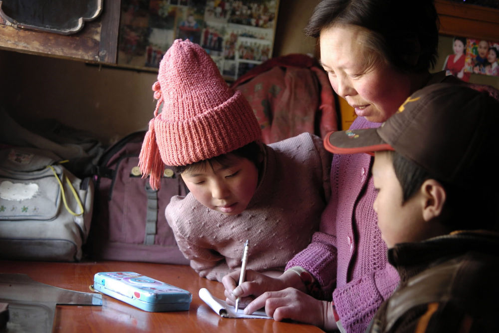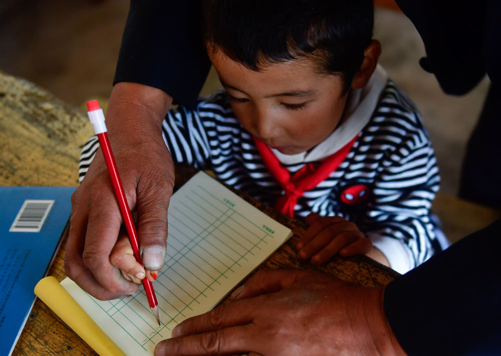 ↑ 2020年8月31日,在青海省海東市循化撒拉族自治縣白莊鎮(zhèn)來(lái)塘村學(xué)校,完么仁增老師在指導(dǎo)一年級(jí)學(xué)生馬文輝學(xué)習(xí)。