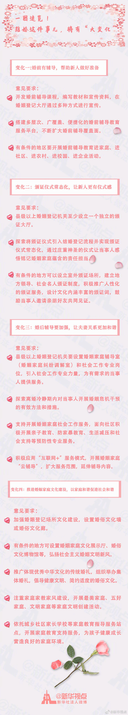 婚姻是家庭的紐帶,婚姻家庭和諧事關(guān)民生幸福和社會(huì)穩(wěn)定。意見要求,要探索開展婚前輔導(dǎo),開發(fā)婚前輔導(dǎo)課程,編寫教材和宣傳資料,在婚姻登記大廳通過宣傳欄、視頻、免費(fèi)贈(zèng)閱等方式進(jìn)行宣傳,幫助當(dāng)事人做好進(jìn)入婚姻狀態(tài)的準(zhǔn)備,學(xué)會(huì)管理婚姻,努力從源頭上減少婚姻家庭糾紛的產(chǎn)生。