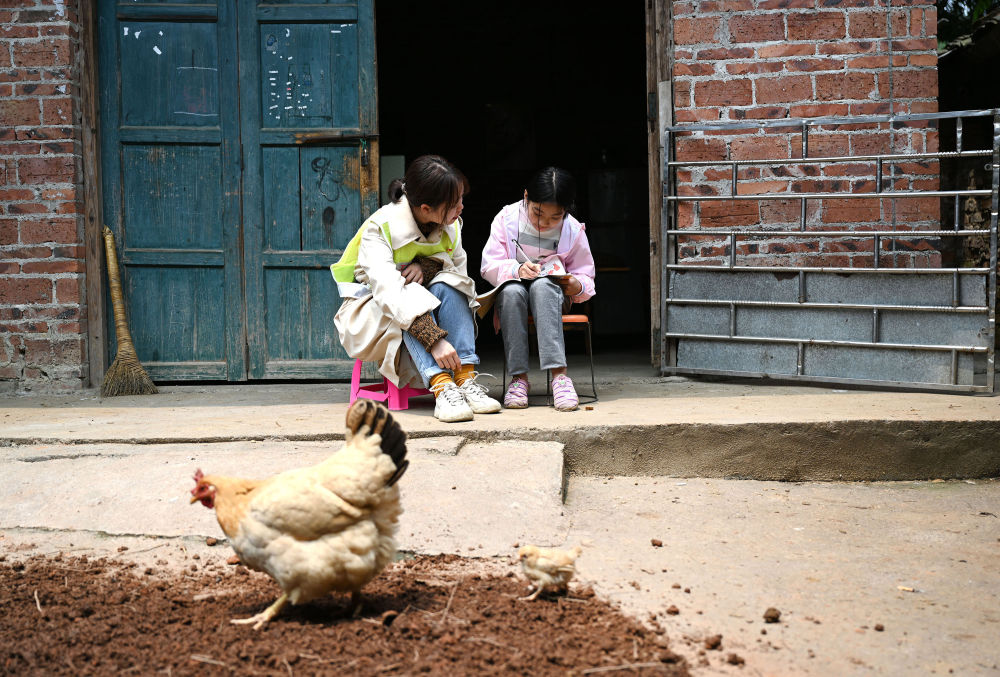 ↑重慶鐵路小學支教老師穆翼(左)和蓮花小學老師陶瑤一同打掃校園