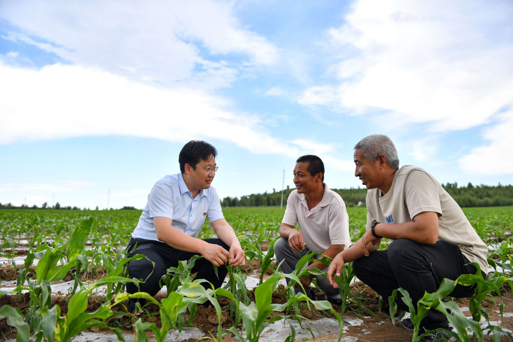 ↑張驊(左)下田了解黑糯玉米生長情況
