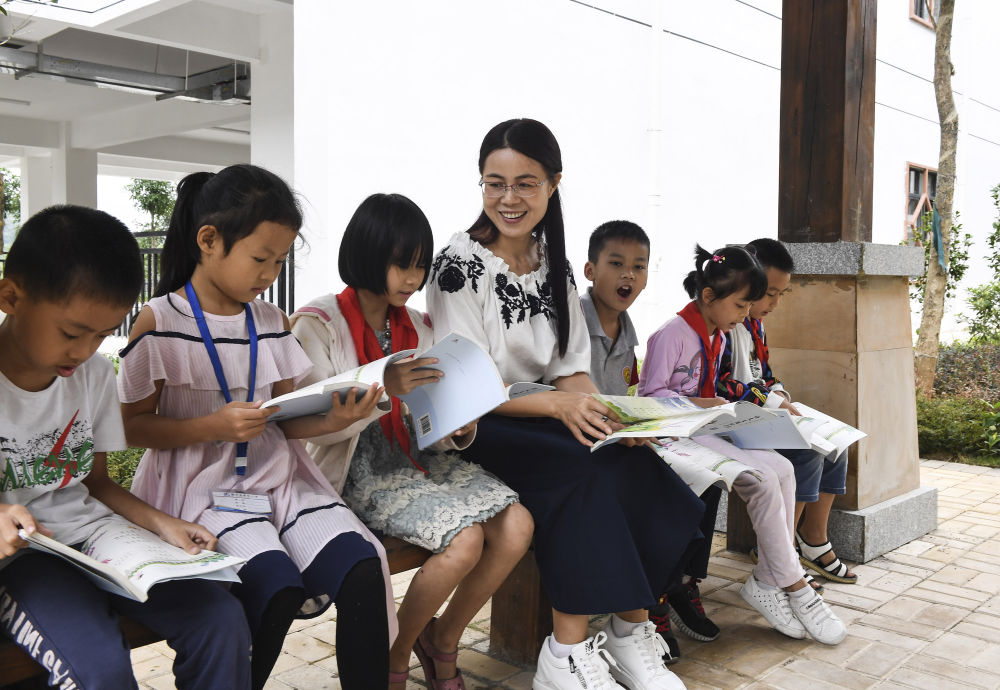 ↑廣東化州教師郭一冰與學生一起閱讀