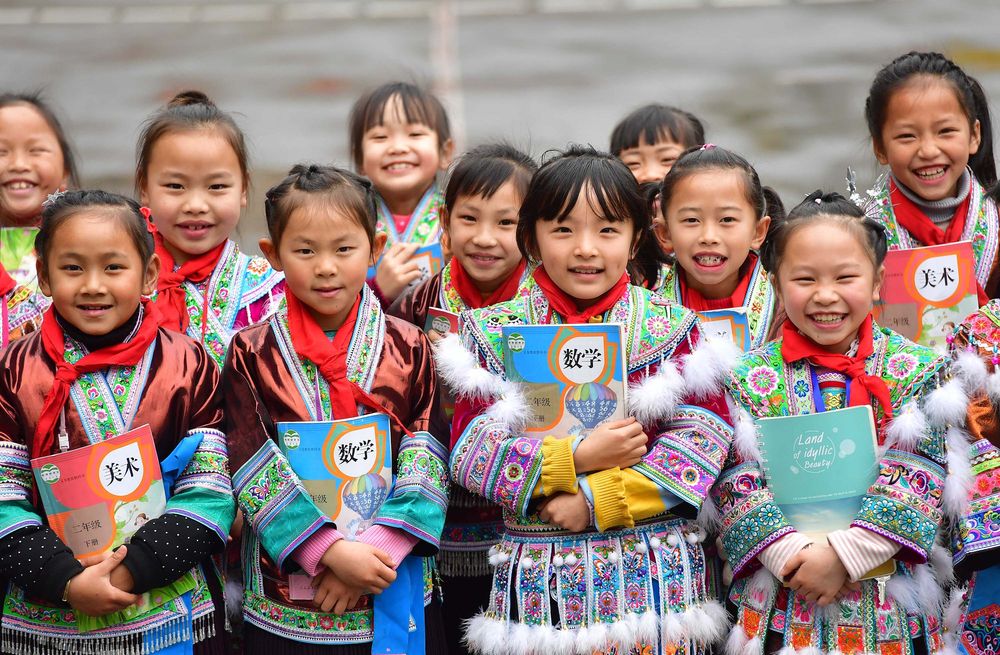 ↑廣西融水苗族自治縣的孩子手捧書本在校園合影