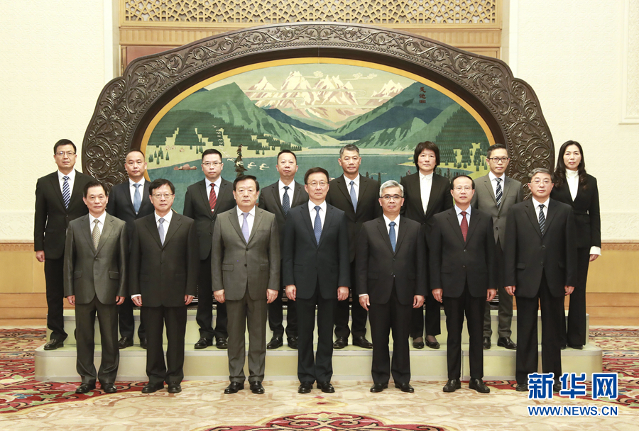 9月16日,中共中央政治局常委、國務(wù)院副總理、中央港澳工作領(lǐng)導小組組長韓正在北京人民大會堂會見澳門特別行政區(qū)保安司司長黃少澤率領(lǐng)的澳門紀律部隊高層代表團,與他們交流并合影留念。 新華社記者 龐興雷 攝
