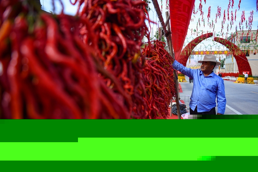 農(nóng)戶在2020年慶祝中國農(nóng)民豐收節(jié)暨循化縣消費(fèi)扶貧“辣椒節(jié)”現(xiàn)場銷售線辣椒。(新華網(wǎng)潘彬彬 攝)