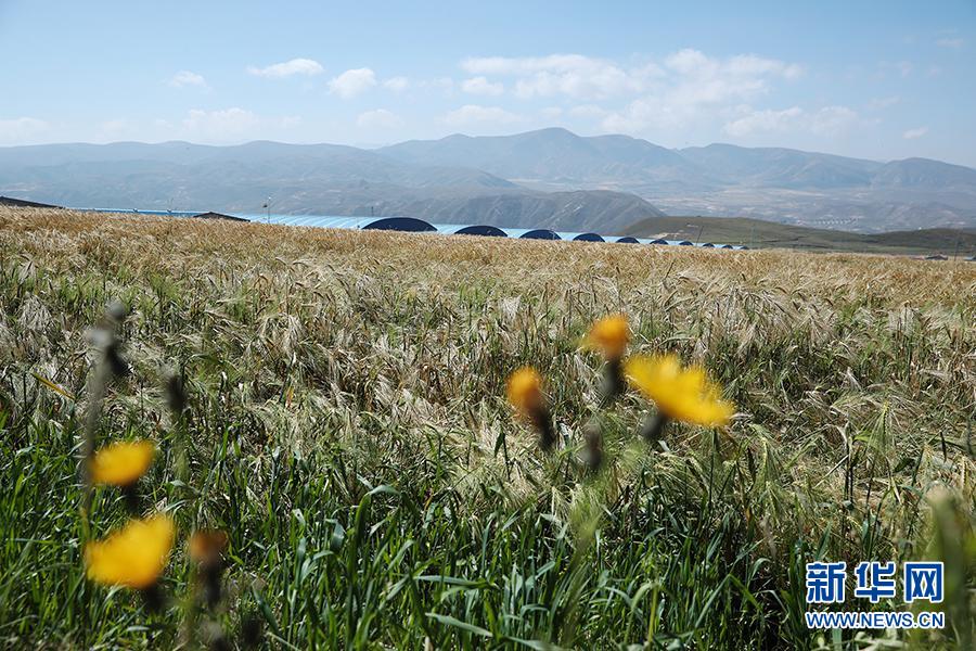 東達(dá)村的青稞迎來豐收,遠(yuǎn)處藍(lán)色頂棚建筑是東達(dá)村養(yǎng)殖場(chǎng)。新華網(wǎng)記者焦鵬攝