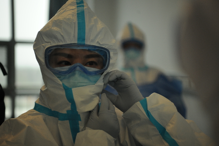 在華中科技大學(xué)同濟(jì)醫(yī)院光谷院區(qū)采訪,進(jìn)重癥ICU前做好防護(hù)準(zhǔn)備
