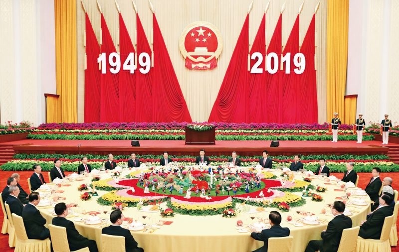 2019年9月30日晚,慶祝中華人民共和國(guó)成立70周年招待會(huì)在北京人民大會(huì)堂隆重舉行。習(xí)近平、李克強(qiáng)、栗戰(zhàn)書、汪洋、王滬寧、趙樂際、韓正、王岐山等黨和國(guó)家領(lǐng)導(dǎo)人與4000余名中外人士歡聚一堂,共慶新中國(guó)70華誕。 新華社記者 黃敬文/攝