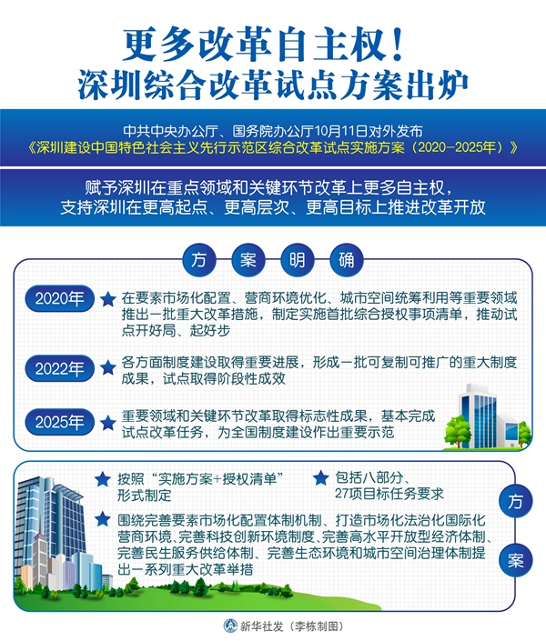 新華社北京10月11日電(記者安蓓、葉前)中共中央辦公廳、國務(wù)院辦公廳11日對(duì)外發(fā)布《深圳建設(shè)中國特色社會(huì)主義先行示范區(qū)綜合改革試點(diǎn)實(shí)施方案(2020-2025年)》,賦予深圳在重點(diǎn)領(lǐng)域和關(guān)鍵環(huán)節(jié)改革上更多自主權(quán),支持深圳在更高起點(diǎn)、更高層次、更高目標(biāo)上推進(jìn)改革開放。