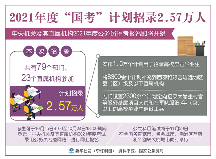 新華社北京10月14日電(記者林暉)記者14日從國(guó)家公務(wù)員局獲悉,中央機(jī)關(guān)及其直屬機(jī)構(gòu)2021年度公務(wù)員招考報(bào)名即將開(kāi)始,本次招考共有79個(gè)部門、23個(gè)直屬機(jī)構(gòu)參加,計(jì)劃招錄2.57萬(wàn)人。