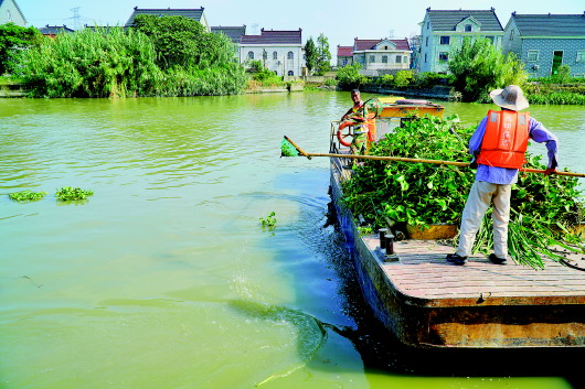 麻溪港上,保潔人員正在打撈水葫蘆。本報(bào)記者許舜達(dá)攝